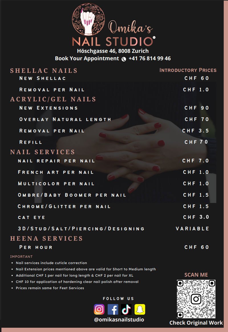 Now, I find myself in Zurich, Switzerland, ready to take on new challenges and continue to pursue my passion. It would be my pleasure to welcome you to my nail table, where I can share my artistry and passion for creating beautiful nails. I look forward to meeting you soon and showcasing my unique talent and abilities.